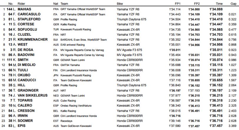 Jules Cluzel, qui passait de la Honda à la Yamaha au sein de l’équipe NRT, réalisait le sixième temps. Mike di Meglio, nouveau venu dans la catégorie, installait la Yamaha R6 du GMT94 à la douzième place. Il était à 1.027 du leader Lucas Mahias et sa marge de progression était substantielle.