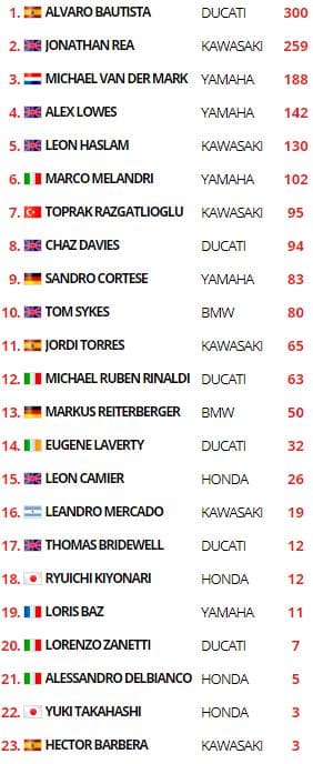 Avec un total de très exactement 300 points, le leader du Championnat du Monde Álvaro Bautista (Aruba.it Racing – Ducati) n’était pas directement menacé en arrivant sur le Circuit Marco Simoncelli, avec 41 points d’avance sur le quadruple champion en titre Jonathan Rea (Kawasaki Racing Team WorldSBK). Après 11 victoires consécutives de l’Espagnol, on estimait l’affaire pliée et le Britannique condamné à la deuxième place finale. Mais Rea n’est en fait qu’à 41 points de Bautista et – à raison de 3 courses par week-end – il reste encore 21 manches à disputer. Rea n’a donc que 2 points à rattraper à chaque course, ce qui n’est pas impossible.