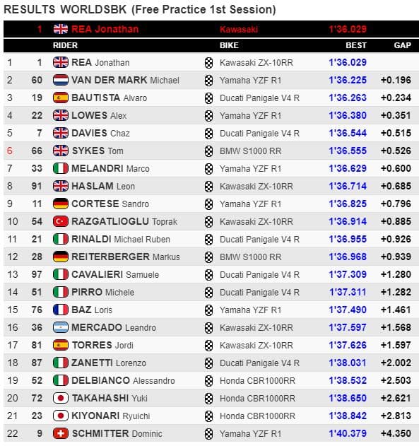 🏁 The chequered flag falls 🏁@jonathanrea tops the timesheets of FP1 ahead of @mickeyvdmark and @19Bautista!#RiminiWorldSBK🇮🇹 pic.twitter.com/ScQfWSwbGR