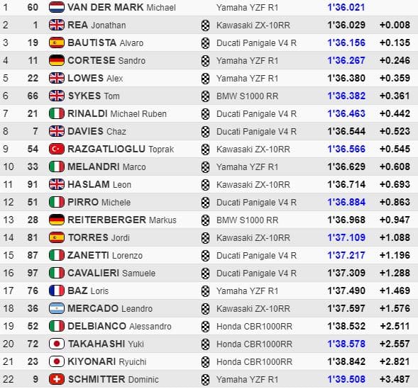Michael van der Mark réalisait un bon 1’36.242 qui l’amenait en deuxième position. Trois marques étaient donc représentées aux trois premières places, avec Kawasaki devant Yamaha et Ducati. Loris Baz se classait quinzième.