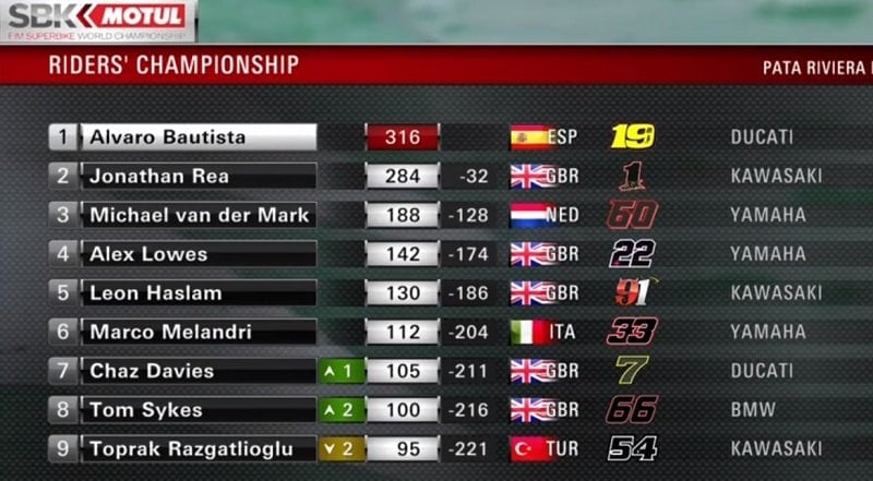 Rea remportait finalement une belle victoire qui le relançait au Championnat, tandis que Sykes ravissait BMW, que Bautista sauvait de précieux points pour le titre, et que Loris Baz effectuait une course splendide pour son récent retour en Classement provisoire du Championnat du Monde Superbike.