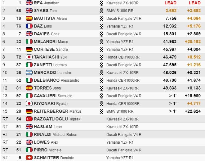 A quelques tours du drapeau à damier, Rea menait avec 5.2 d’avance sur Sykes, 11.5 sur Bautista et 11.9 sur Baz. Delbianco était remonté sixième à 36.5.