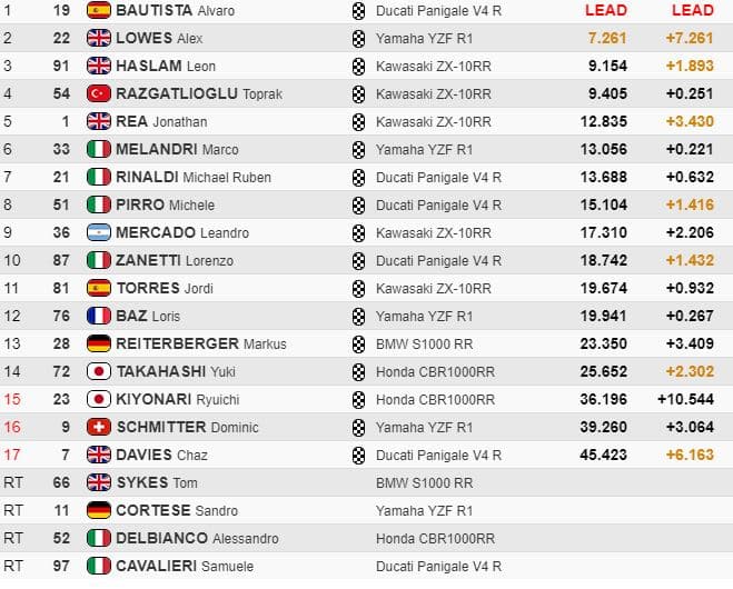 Bautista paradait donc en tête après ces deux chutes, avec 7.8 d’avance sur Lowes désormais deuxième, devant Sykes, Haslam et Razgatlioglu. Haslam ravissait la troisième position à Sykes qui connaissait un problème technique et devait abandonner.