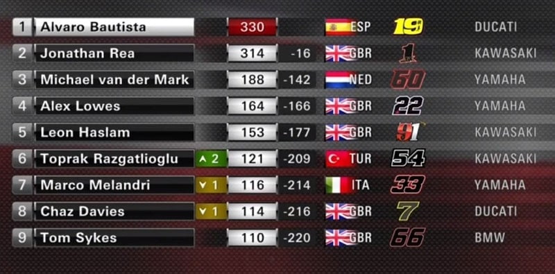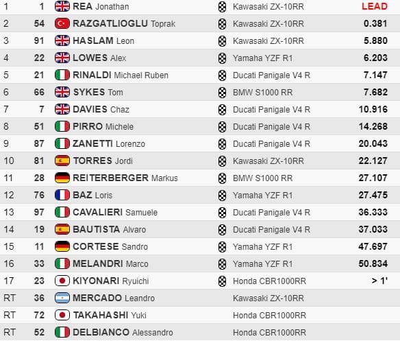 A 15 tours de la fin, seul Rea réussissait à suivre Razgatlioglu, tandis qu’Haslam troisième était attaqué par Melandri. Lowes perdait du terrain, devant Rinaldi, Sykes et Davies. Bautista 19e pouvait espérer marquer de petits points, tout comme Cortese qui était reparti lui aussi après sa chute.