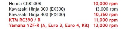 La Kawasaki Ninja 400 sera équipée d’une bride d’admission pour réduire la puissance de la machine de 399cc. Les poids combinés pilote/machine seront légèrement différents pour tenir compte des niveaux de couple très différents des machines.
