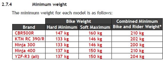La Kawasaki Ninja 400 sera équipée d’une bride d’admission pour réduire la puissance de la machine de 399cc. Les poids combinés pilote/machine seront légèrement différents pour tenir compte des niveaux de couple très différents des machines.