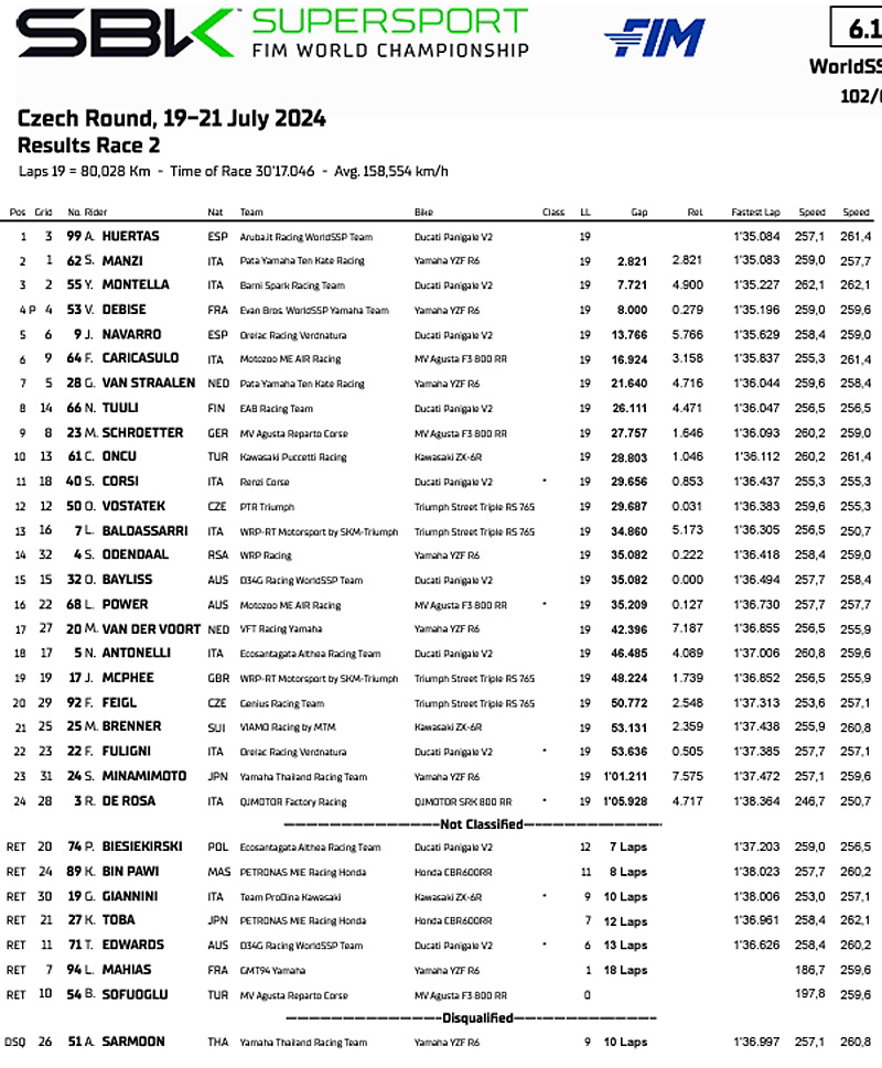 Non pas pour la victoire, puisque d’une grille composée de Stefano Manzi (Pata Yamaha Ten Kate Racing), Yari Montella (Barni Spark Racing Team), Adrian Huertas (Aruba.it Racing WorldSSP Team), Valentin Debise (Evan Bros. WorldSSP Yamaha Team), Glenn van Straalen (Pata Yamaha Ten Kate Racing) et Jorge Navarro (Orelac Racing Verdnatura) suivant les meilleurs tours réalisés en course 1, on s’est vite retrouvé avec Yari Montella en tête avant de s’incliner devant Stefano Manzi et Adrian Huertas, ce dernier parvenant ensuite à s’échapper pour remporter sa 6e victoire consécutive malgré un Stefano Manzi toujours très incisif en début de course.