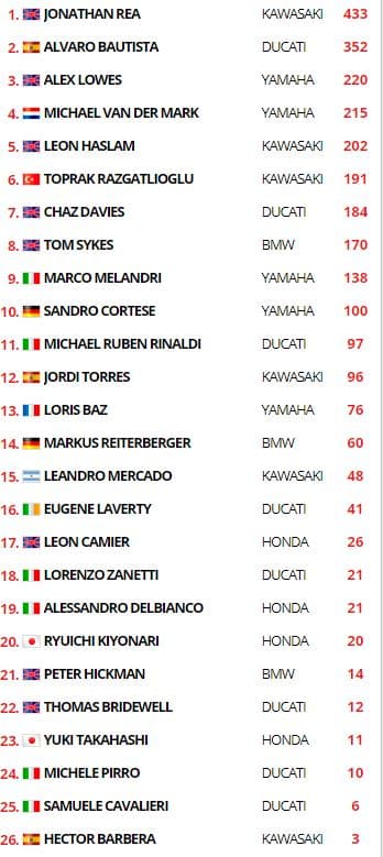 Classement provisoire du Championnat du Monde Superbike :