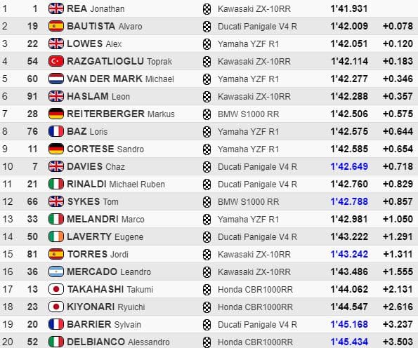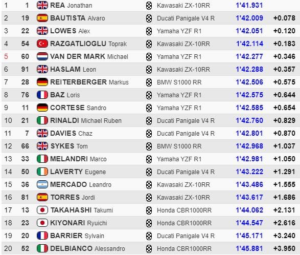 Rea terminait la journée en première position devant Bautista, Lowes et Razgatlioglu, tandis que Baz était huitième et Barrier dix-neuvième.