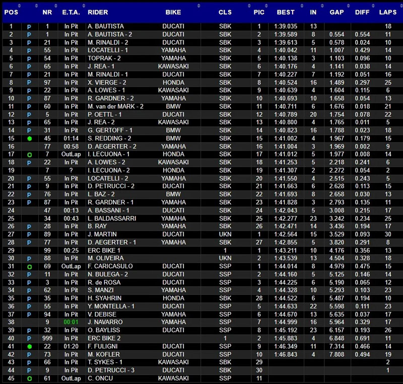 L’officiel Kawasaki et sextuple titre Rea ferme le top 5 provisoire, devant la Honda de Vierge malgré une chute et la ZX-10RR d’Alex Lowes. Le top 10 est tenu par Remy Gardner, à tout de même une seconde et demi. L’Australien résiste à la première BMW menée par Van der Mark. Les autres M1000RR restent à bonne distance, ce qui commence à devenir inquiétant pour la firme bavaroise. De son côté, Danilo Petrucci a commencé à prendre ses marques avec la version 2023 de la Panigale V4R.