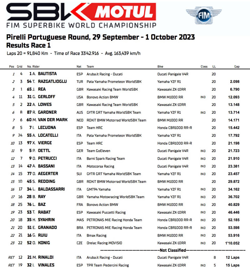 WSBK Portimão Superbike Course 1 : Alvaro Bautista passe et s’en va, Ducati s’offre le titre constructeurs