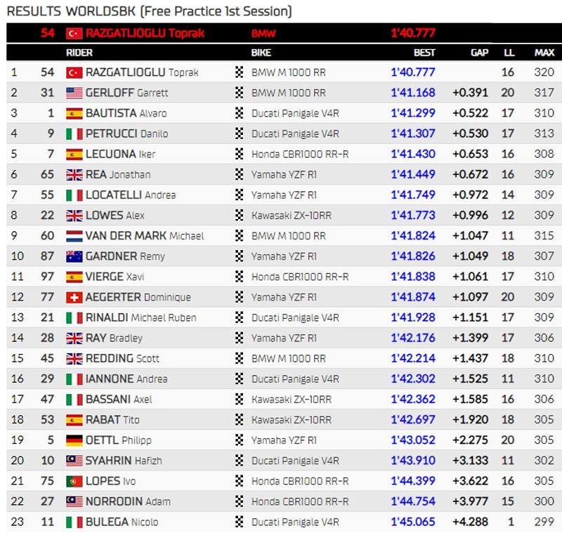Résultats de la FP1 du WorldSBK Superbike à Portimao :