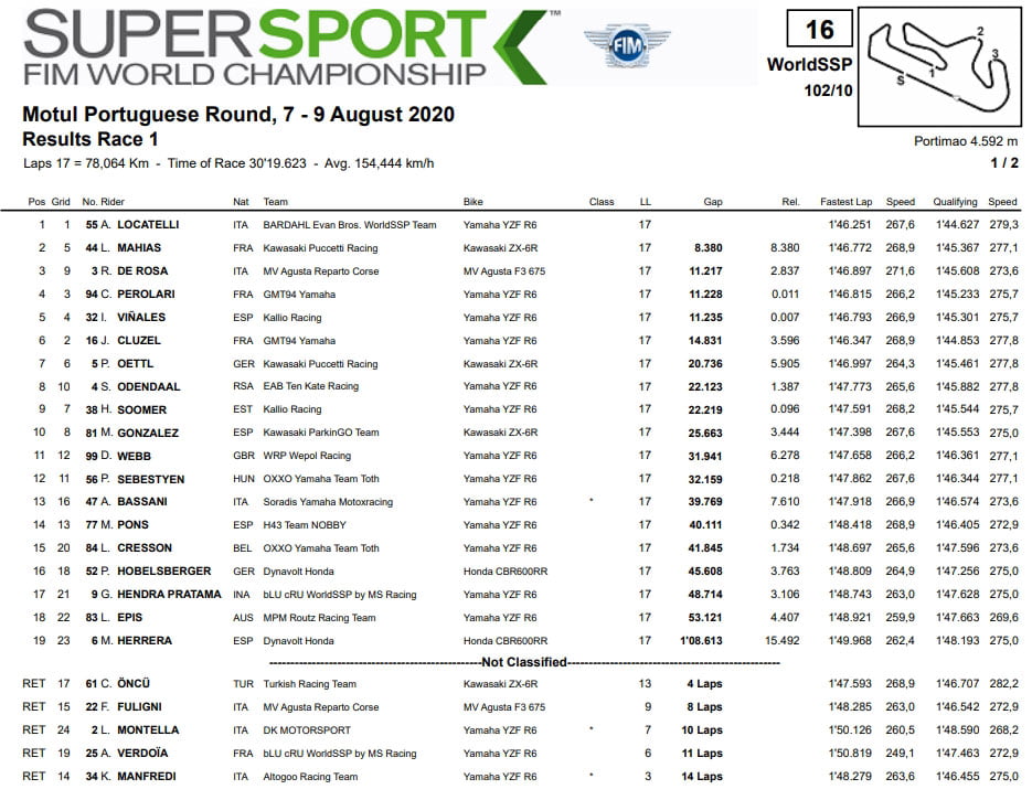 La course a commencé tardivement, en raison de l’attente de l’hélicoptère utilisé pour transporter Sandro Cortese à l’hôpital de Faro. Après être parti à la faute, Jules Cluzel est revenu dans la course pour terminer sixième. Pour Andrea Locatelli, le dernier tiers de la course a été une promenade de santé dans les collines de l’Algarve. La deuxième place a été prise par Lucas Mahias, avec la Kawasaki Puccetti, tandis que pour la dernière place sur le podium Raffaele De Rosa a brûlé la politesse à Corentin Perolari et Isaac Viñales.