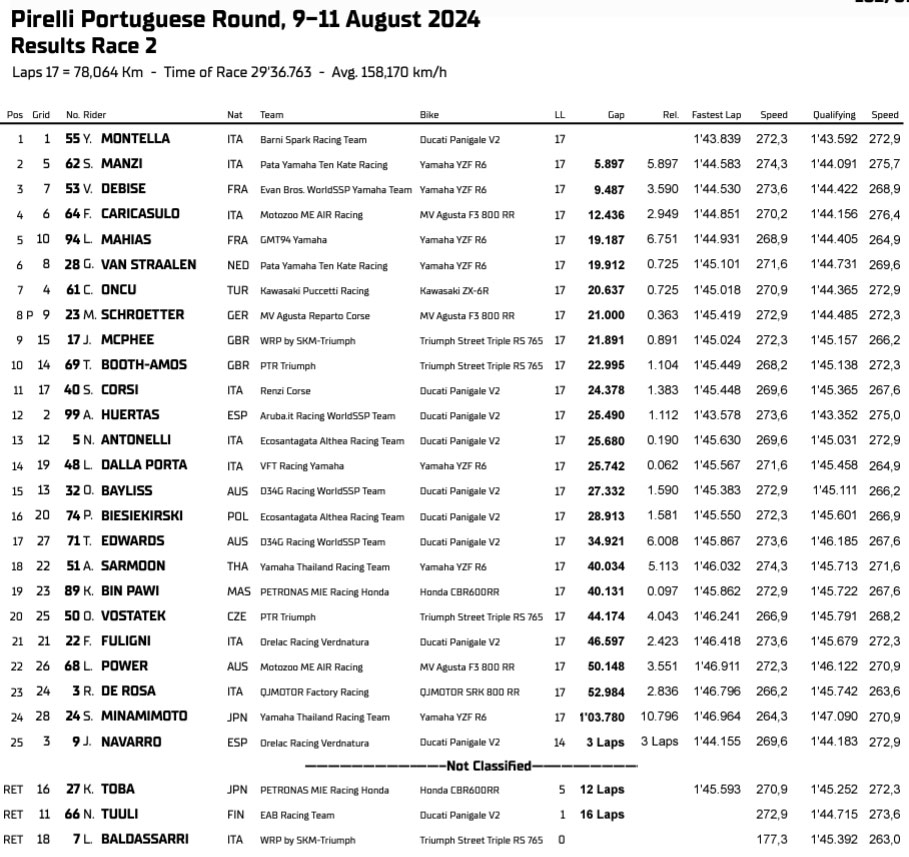 Résultats de la Course 2 du WorldSBK Supersport à Portimao :