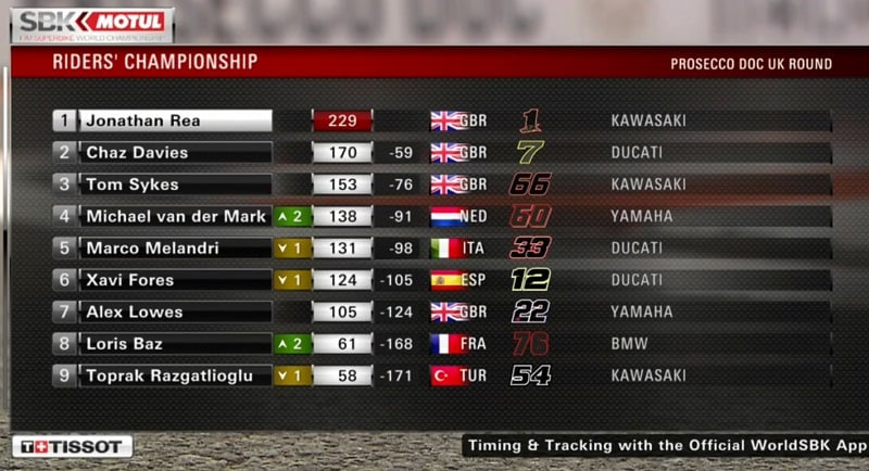 Les deux Kawasaki officielles conservaient l’avantage devant les deux Yamaha, l’Aprilia de Savadori et la BMW de Baz. Tom Sykes prenait le commandement lors du quatrième tour. Mais il sortait trop large au freinage et Rea le repassait, suivi de près par van der Mark.