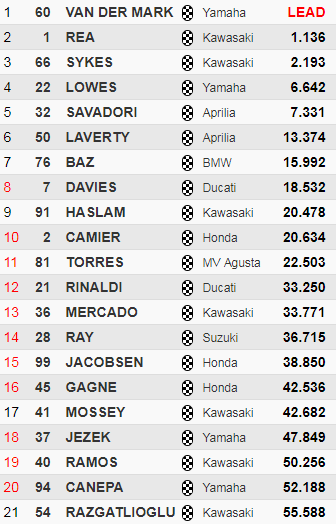 Melandri chutait sans gravité, tandis que van der Mark augmentait son avance sur Rea, Sykes, Lowes et Savadori. A 4 tours du drapeau à damier, van der Mark possédait 0.6 d’avance sur Rea, 1.7 sur Sykes et 4.1 sur Lowes.