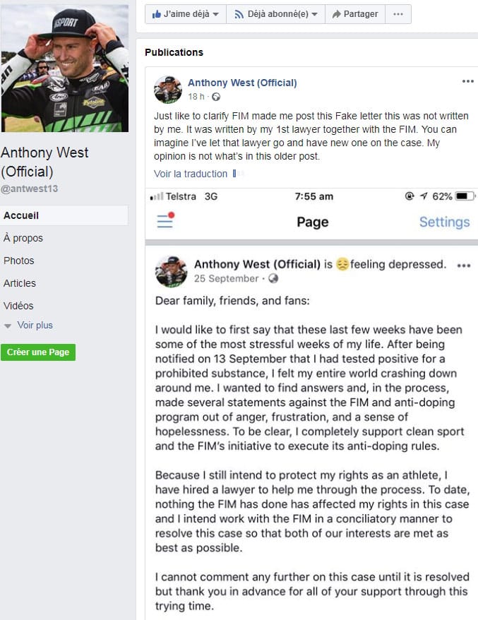 M. Anthony West est provisoirement suspendu avec effet au 14 septembre 2018. Il lui est donc interdit de participer à toute compétition ou activité de motocyclisme jusqu’à nouvel ordre et dans l’attente d’une décision définitive sur le fond de l’affaire.
