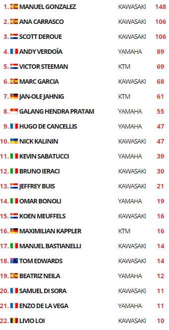 Ce vendredi matin, après la FP3, le meilleur temps des essais libres était à mettre au crédit d’Ana Carrasco en 2’15.067, devant Gonzalez, Edwards et Verdoïa. De Cancellis de classait 18e et di Sora 27e.