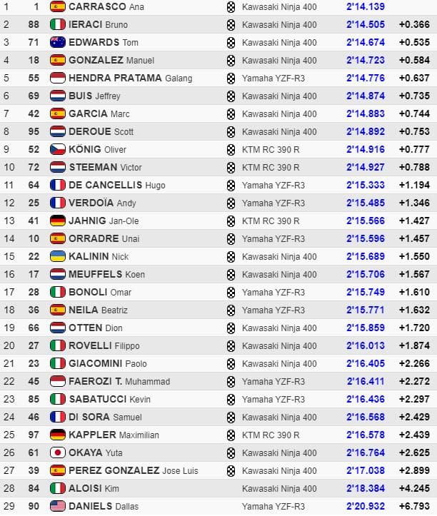 A l’issue de la première journée, Manuel González (Kawasaki ParkinGO Team) avait réalisé le meilleur temps en 2’15.438 devant Ana Carrasco (Kawasaki Provec WorldSSP300), Andy Verdoïa (BCD Yamaha MS Racing), Oliver König (Freudenberg KTM WorldSSP Team), Dion Otten (MTM Racing Team) et son coéquipier Filippo Rovelli (le fils du propriétaire de l’équipe Kawasaki ParkinGO Team).