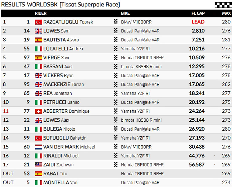 Alex Lowes (bimota by Kawasaki Racing Team) a pris la sixième place après une belle bagarre avec Xavi Vierge (Honda HRC). Ryan Vickers, un temps bien placé, a été pénalisé par un Long Lap avant de chuter dans l’avant-dernier tour.