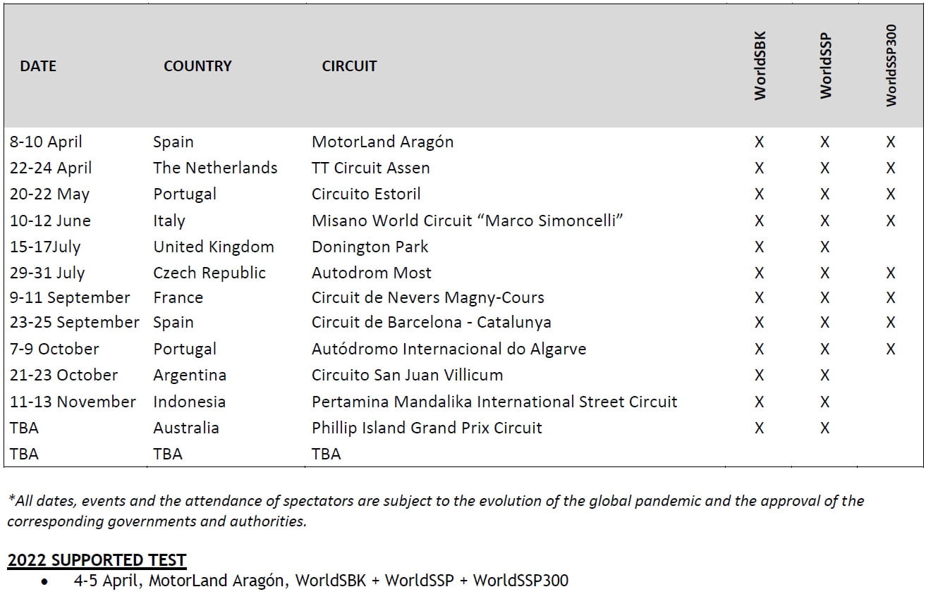 Voici donc ce qui attend en principe les concurrents des Championnats du monde MOTUL FIM Superbike World, FIM Supersport et Supersport 300, y compris le test officiel qui se tiendra les 4 et 5 avril à Aragon.