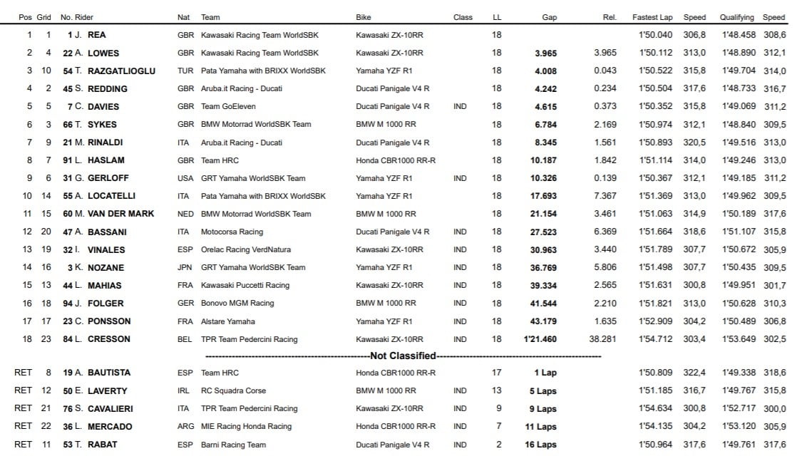 Derrière le top 3, la quatrième place revient finalement à Redding, auteur d’un superbe manœuvre de dépassement sur Davies dans les dernières encablures, alors que Sykes doit pour sa part se contenter de la sixième place devant Michael Ruben Rinaldi et Leon Haslam.