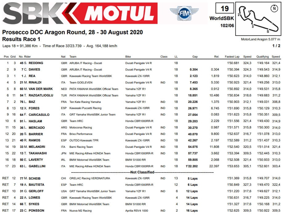 Un superbe doublé Ducati lors de la première course à Aragón : Scott Redding mène devant Chaz Davies et revient en tête du Championnat du monde. Jonathan Rea seulement troisième, Michael Rinaldi progresse.