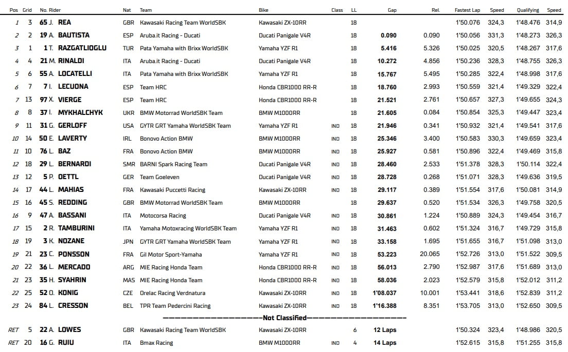Dès lors, la lutte pour la victoire allait se recentrer sur Bautista et Rea, qui à leur tour échangeaient à plusieurs reprises leur position en tête de course, parvenant même à faire le trou sur Razgatlioğlu. Mais à ce petit jeu, c’est bien Rea qui a obtenu gain de cause sur le long terme, après une défense acharnée et pas à pas face à son rival ibérique jusque dans le tout dernier enchaînement du tout dernier tour, où il a su parfaitement décroiser sa trajectoire pour contrer une dernière attaque. Le Nord-Irlandais commence ainsi la saison 2022 comme il avait fini la saison 2021 : par une victoire, ce qui devrait le rassurer après que sa série de six titres consécutifs ait été interrompue l’an dernier.