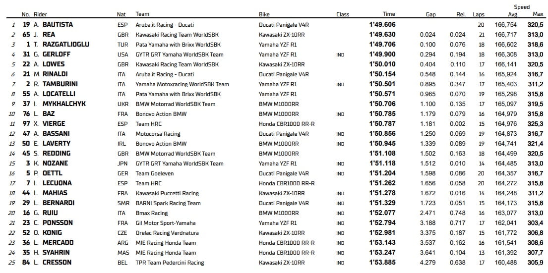 La septième place est quant à elle revenue à un surprenant Roberto Tamburini, devant Andrea Locatelli et Illya Mykhalchyk. Loris Baz, qui évolue cette année sous les couleurs de BMW et avait déjà réalisé une bonne prestation ce matin, a confirmé lors de ces FP2 avec l’obtention de la dixième place.