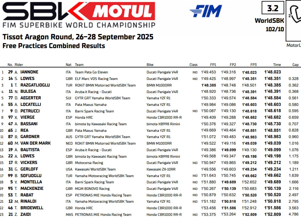 L’ancien pilote MotoGP Andrea Iannone est parvenu à prendre la tête du classement combiné à Motorland Aragon et termine la troisième séance d’essais en tête. Nicolò Bulega y bat Toprak Razgatlioglu. Course 1 à 14h.