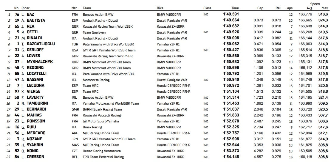 Bautista n’a pas tardé à rejoindre à son tour le haut de la feuille des temps, assurant un temps une suprématie des Ducati Panigale V4R au cours de cette séance, avant que le nouveau venu dans la catégorie, l’Allemand Philipp Öttl, ne vienne s’intercaler entre les deux pour jouer les trouble-fêtes.