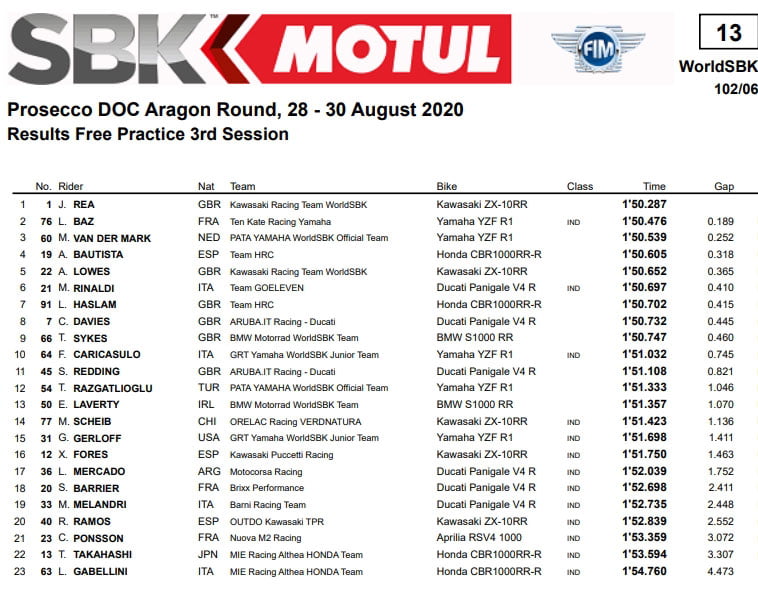 Côté négatif, le onzième temps de Scott Redding est étonnant après un vendredi marqué par plus d’ombres que de lumières. En FP2, la session la plus significative du point de vue de la course, le Britannique a été longtemps au milieu du groupe, ne remontant la pente qu’à la fin, avec le pneu neuf. Dans la troisième séance, Scott Redding, deuxième du championnat du monde à quatre points de Jonathan Rea, a concédé huit dixièmes à son rival direct. Michael Rinaldi a nouveau été le pilote Ducati le plus rapide, sixième, encore meilleur que Chaz Davies qui a toujours un bon rythme et, de l’avis de Rea, est le favori. Sur cette piste, le Gallois a déjà triomphé sept fois, deux avec BMW et les autres avec les Rouges. Pas de progrès pour Marco Melandri , qui conclut la FP3 avec le dix-neuvième chrono.