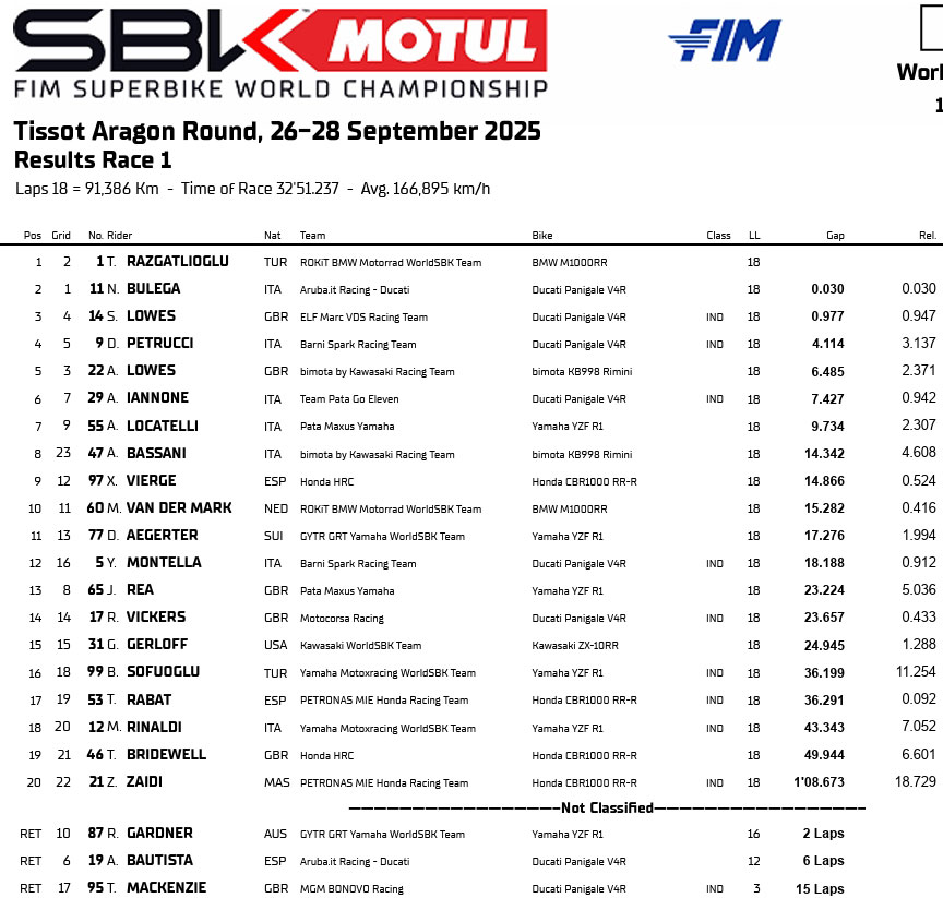 P1 – Toprak Razgatlioglu (ROKiT BMW Motorrad WorldSBK Team) : « Je suis vraiment heureux car je n’avais jamais gagné ici auparavant. Désormais, j’ai ma première victoire à Aragón. Ce fut une course difficile car Ducati avait un gros avantage dans le dernier virage et dans la ligne droite, mais j’ai attaqué à chaque tour. Nous devons encore progresser dans certains virages car la moto n’est pas encore à 100 %, mais mon équipe travaille très dur. Demain, nous avons encore deux courses et je resterai calme pour gagner à nouveau. »