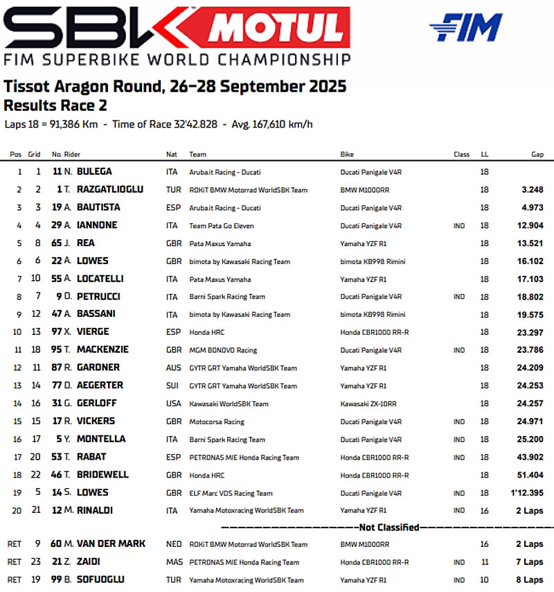 Une erreur de Razgatlioglu au virage 7 au 12ᵉ tour a permis à Bulega de creuser immédiatement un écart d’une seconde. Son rythme constant lui a assuré une marge de victoire confortable de 3,2 s.