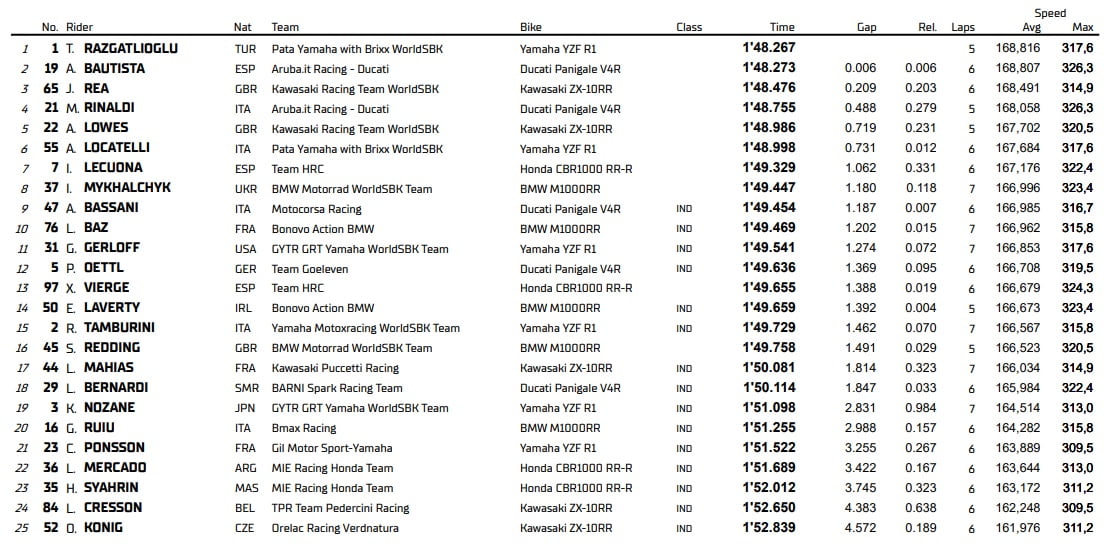 Michael Rinaldi place quant à lui sa Ducati en quatrième position, devant Alex Lowes et Andrea Locatelli, alors que sur la troisième ligne Iker Lecuona réalise une très belle prestation pour sa première en Superbike avec le septième temps sous le drapeau à damier.