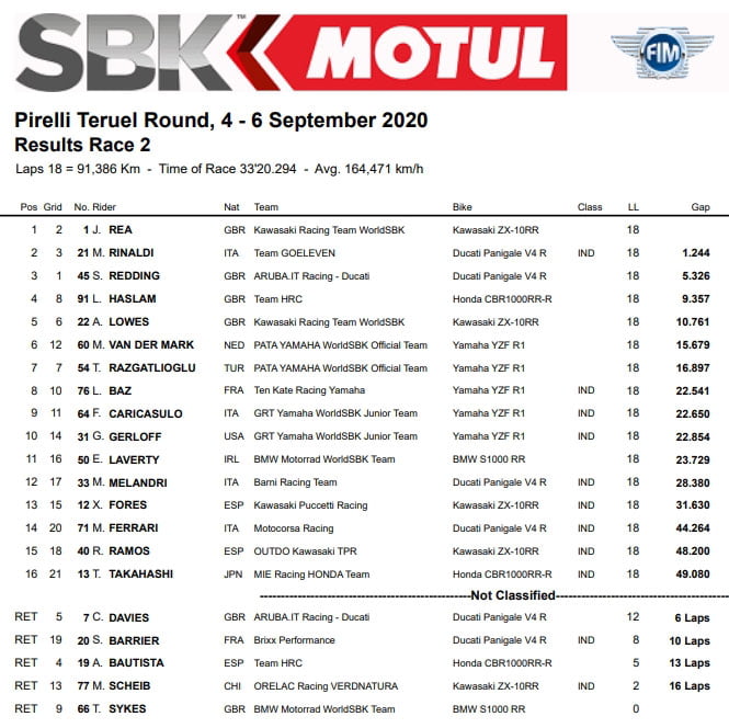 La cible de Jonathan Rea était Scott Redding, non seulement pour des raisons évidentes de classement, mais aussi parce que son rival l’avait giflé deux fois dans un duel au corps à corps en sept jours. La première fois lors de la course 1 du premier round, la deuxième ce matin lors de la course sprint. Quand, grâce à cet avantage notable, Rea est apparu un peu timide, Redding s’est à nouveau retrouvé la tête baissée, mais cette fois Jonathan n’a pas lésiné sur les risques et a réagi furieusement: il voulait à tout prix battre Redding, et il a fini par le faire. A ce moment-là, Michael Rinaldi, qui l’avait battu sans appel samedi, n’a rien pu faire. Jonathan Rea a déjà compris que le jeune pilote de Rimini de 24 ans comptera beaucoup, à partir de maintenant, et surtout en 2021 lorsque Rinaldi aura la Ducati officielle. Autre duel, autres risques : Pour gagner cette course, le roi a dû utiliser son sabre, en courant sur le fil du rasoir. Il a eu de la chance à plusieurs reprises, car les champions ont aussi de la chance…