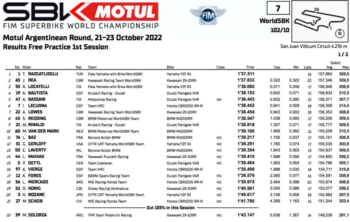 FP1 comes to an end for #WorldSBK, and it's Razgatlioglu who takes P1 honours! 📊#ARGWorldSBK 🇦🇷 pic.twitter.com/DvvT9LTWgW