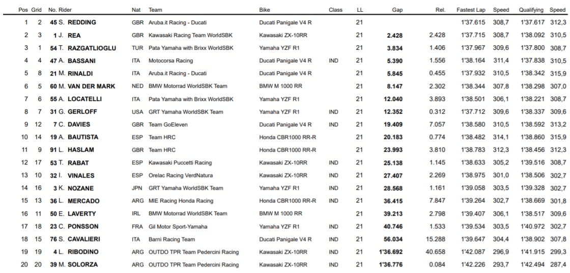 La joute a été superbe avec l’Irlandais du Nord, mais aussi Redding qui a gagné pour l’honneur, puisque, avec sa Ducati, il est maintenant mathématiquement hors-jeu pour la récompense suprême. Puisque l’on parle de comptabilité, le leader du classement général Toprak Razgatlioglu avait 24 points d’avance en arrivant en Argentine sur le champion en titre Jonathan Rea. Après deux victoires et une troisième place à San Juan, il en a maintenant 30. 62 unités sont encore en jeu dans la finale en Indonésie qui aura lieu le troisième week-end de novembre. Le vainqueur dans la catégorie à 18 reprises a de bonnes chances de devenir le premier champion du monde turc de Superbike.
