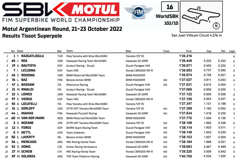 Le Superbike Superpole en Argentine voit Toprak Razgatlioğlu battre Jonathan Rea et Álvaro Bautista. Le champion en titre est le favori de la course 1.