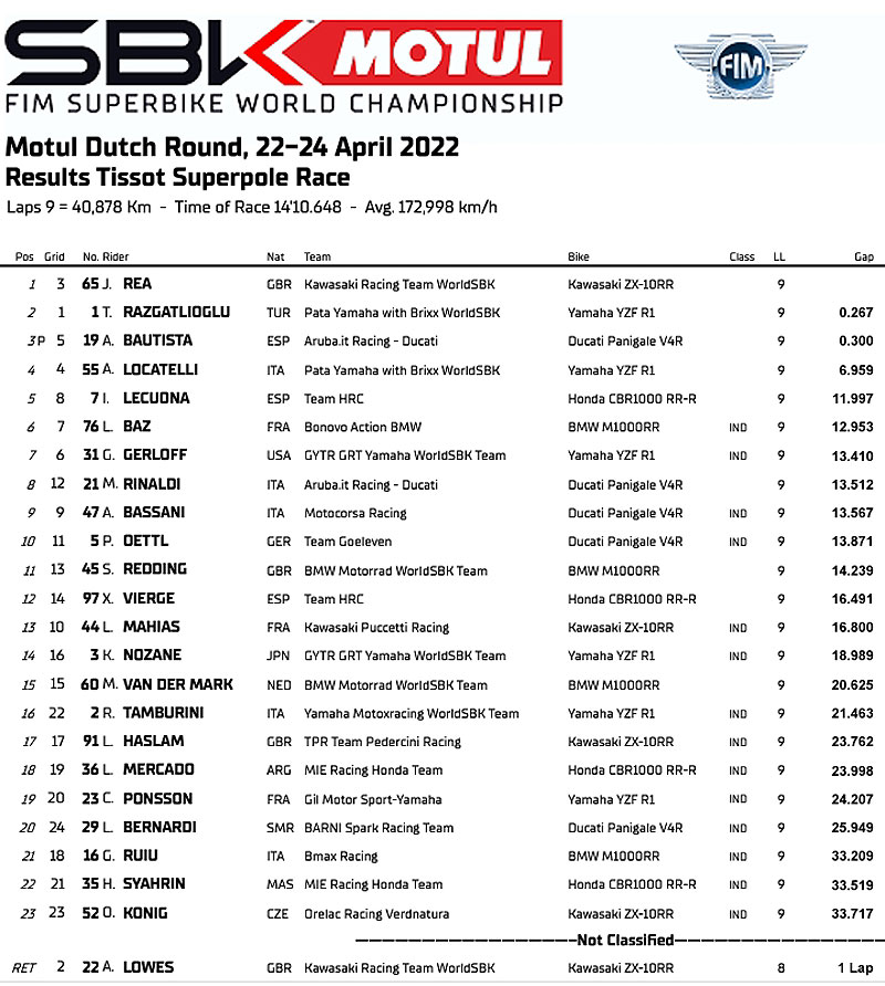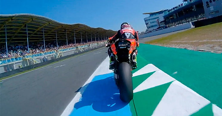 La course s’est déroulée sur neuf tours au lieu de dix. Le départ initial a été avorté en raison d’un problème technique sur la BMW de Gabriele Ruiu, qui a quitté la grille. Avant que les mécaniciens ne retournent sur la grille pour la procédure de ‘départ rapide’, Jonathan Rea s’est installé sur l’avant de la Kawasaki pour essayer de garder le pneu avant chaud : quand on dit qu’il faut penser à tout…