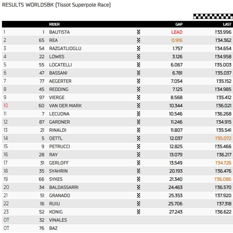Les températures de 14° dans l’air et 20° au sol sont fraîches mais le soleil est bien présent quand les 25 pilotes de la troisième manche du championnat du monde Superbike s’alignent sur la grille de départ pour la course Superpole de 10 tours sur le TT Circuit Assen.