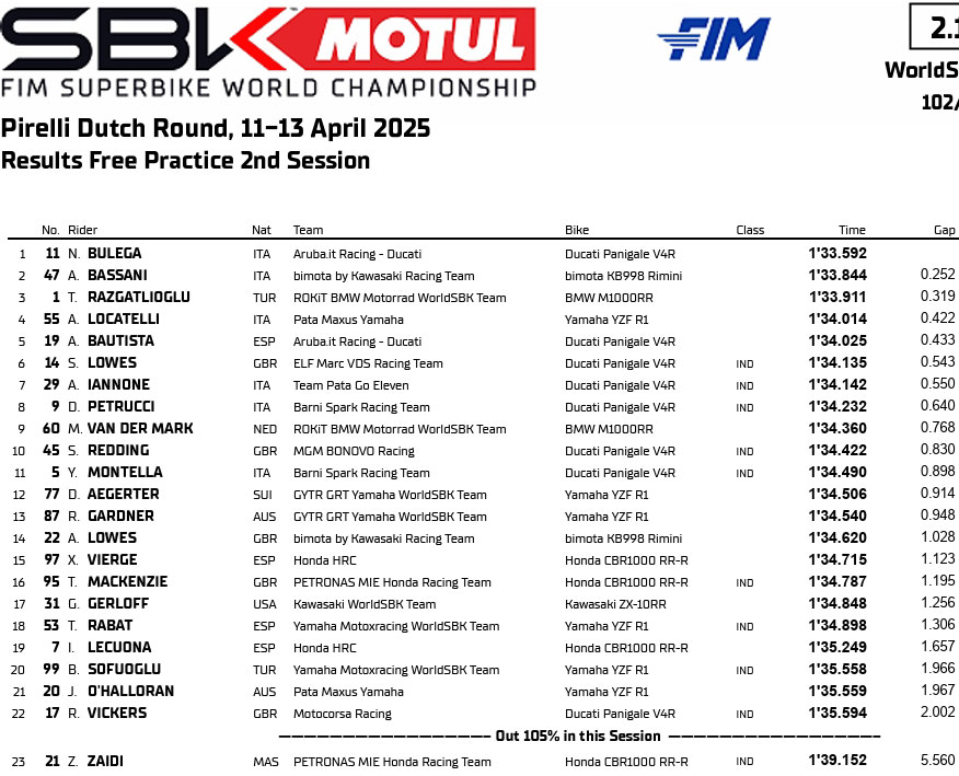 Résultats de la FP2 WorldSBK Superbike à Assen :