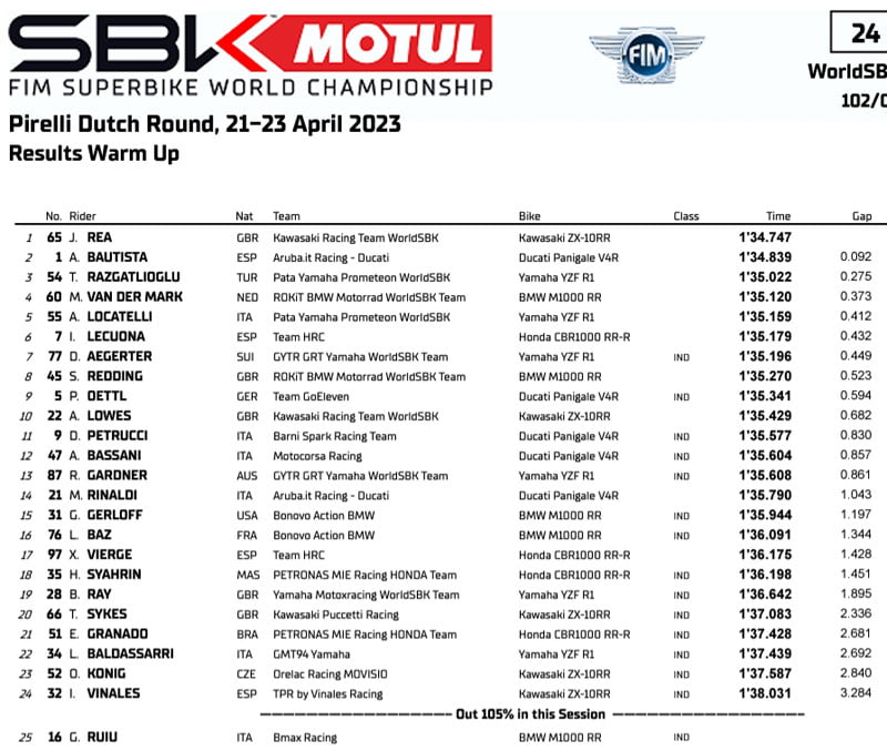 Lors du warmup, quinze minutes à peine dans l’air vif du matin hollandais (10 °C dans l’air, 12 °C sur l’asphalte), c’est Jonathan Rea qui signe le meilleur temps, au terme d’une belle série de tours rapides. Avec l’asphalte froid, et sur une courte distance, la Kawasaki pourrait tenir tête à la Ducati d’un Alvaro Bautista déchaîné. On le vérifiera dans la course sprint, qui débute à 11 heures. Pour la course 2, en revanche, il sera difficile d’inverser le résultat de l’apéritif de samedi : avec cette génération de pneus ultra-tendres, Álvarito est à l’aise, a l’inverse de Rea et Toprak  Razgatlioğlu (troisième de la course 1) qui ont dû se contenter du SC2 à l’avant. Lors du warm-up, la piste n’était pas parfaite, il y avait des plaques d’humidité à certains endroits après la pluie de la nuit. Mais quoi qu’il en soit, ce sont les trois pilotes habituels qui mènent la danse.