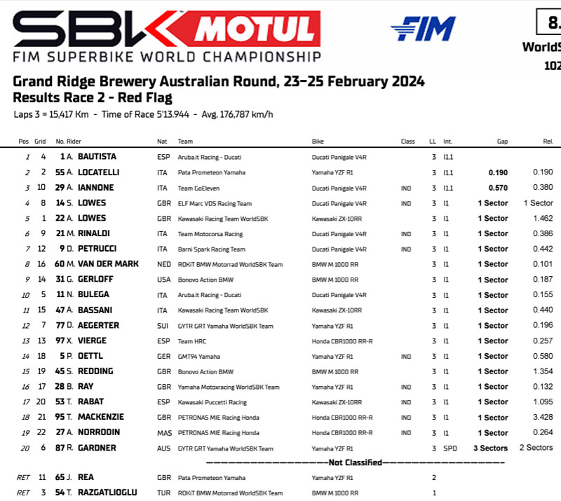 Le premier classement de la Course 2 de WSBK Superbike en Australie au drapeau rouge :