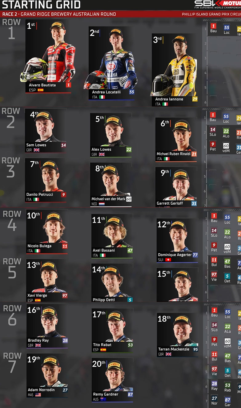 Un moteur qui explose sur la BMW de Toprak Razgatliogu, un pneu qui déclare forfait sur la Yamaha de Remy Gardner suite à un contact avec Jonathan Rea, un Andrea Iannone de loin le plus rapide dans la première partie de la course, un Jonathan Rea qui finit par chuter au virage 11 et est évacué au centre médical, ce qui entraîne les drapeaux rouges pour une épreuve désormais réduite à 11 tours supplémentaires, un Alvaro Bautista voulant reprendre ses vieilles habitudes des deux dernières années; voici une partie de ce que les Superbike nous ont présenté en seulement 3 tours sur le circuit australien de Phillip Island avant la 2e partie de la course-2 ! Mais que s’est-il passé dans cette manche aux multiples rebondissements ?