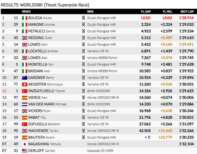 En tête, Nicolo Bulega et Andrea Iannone parviennent à se détacher du peloton, se créant un avantage de 2 secondes en 2 tours, devant Danilo Petrucci (Barni Spark Racing Team), Scott Redding (MGM BONOVO Racing) et Michael van der Mark (ROKiT BMW Motorrad WorldSBK Team).