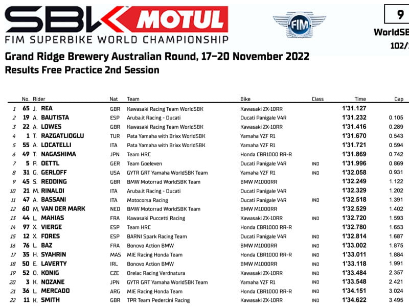 Parmi les trois Magnifiques, le seul qui n’a pas progressé en FP2 est Toprak Razgatlioğlu, qui vient de réaliser son triplé en Indonésie. Cependant, il n’est pas loin derrière, à seulement quatre dixièmes de seconde de Rea : le Turc est également précédé par l’autre Kawasaki d’un Alex Lowes, qui dans le passé a également réussi à narguer Jonathan Rea sur le fil ici. La surprise du jour est venue de Testuta Nagashima, 40 ans, pilote d’essai du HRC qui, en remplacement d’Iker Lecuona, a propulsé la CBR-RR en sixième position, à seulement sept dixièmes de la tête. Le pilote japonais a donné un gros coup de semonce à Xavi Vierge, le titulaire du Superbike qui a sombré en seizième position, près d’une seconde plus lent que son compagnon occasionnel.