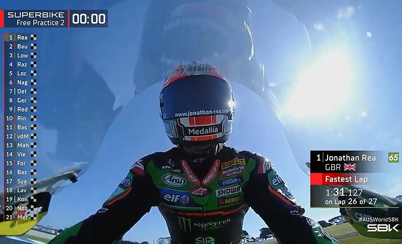Jonathan Rea met le point final à un vendredi dominateur. Il a fallu les virages rapides de Phillip Island pour remettre au premier plan le Cannibale, qui est en panne de victoire depuis mai dernier (Estoril) mais qui a déjà triomphé six fois ici. Il a été très rapide à la fois le matin et lors de la dernière séance, où il a imprimé un tour rapide en 1’31.127 à la fin d’un relais à l’attaque. Après avoir souhaité la pluie toute la saison, en vain, maintenant qu’elle semble vraiment tomber, Jonathan Rea craint que le mauvais temps attendu pour le week-end ne remette tous les plans en l’air. L’as de Kawasaki devance un Álvaro Bautista toujours très rapide, malgré une banale chute ce matin : seulement 105 millièmes séparent les deux.