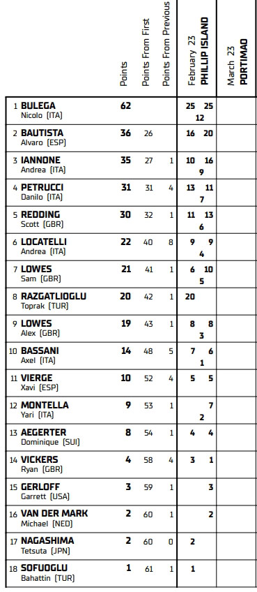 Classement général Superbike après Phillip Island en Australie :