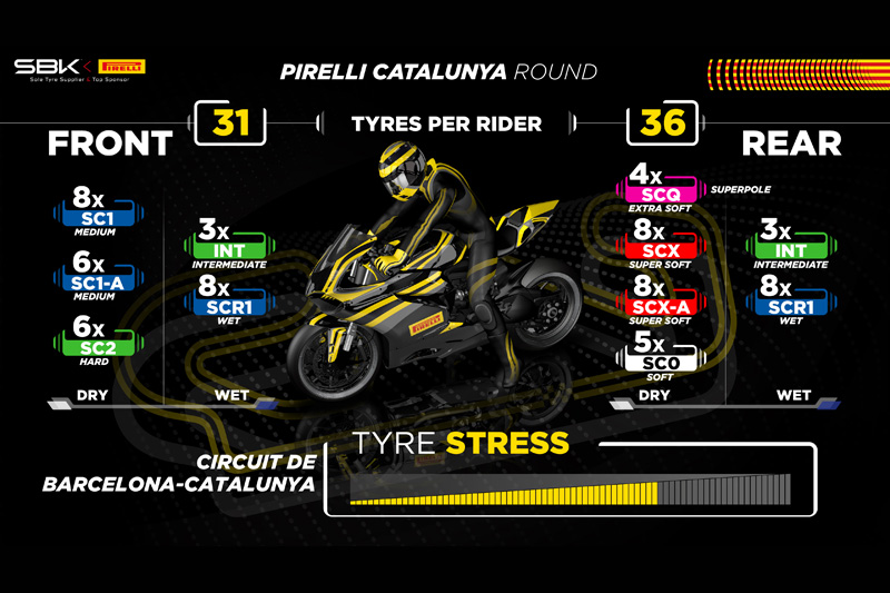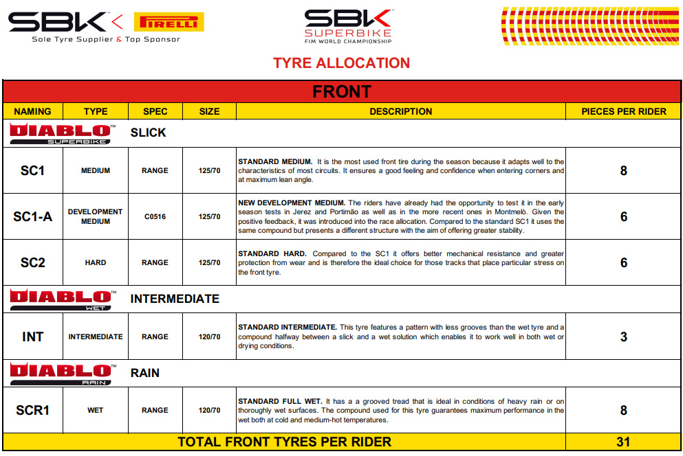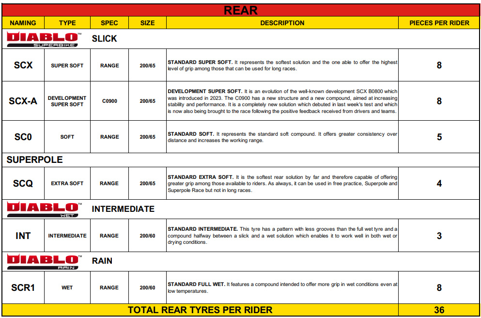 – Allocation de pneus : en plus des nouveaux pneus déjà mentionnés ci-dessus, les pilotes du WorldSBK disposeront des pneus standard SC1 et SC2 à l’avant et SCX et SC0 à l’arrière, en plus du SCQ exclusivement destiné à la Superpole et à la Superpole Race. Le choix se réduit en WorldSSP, où les pilotes pourront choisir entre SC1 et SC2 à l’avant et SCX et SC0 à l’arrière.